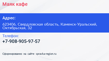 Маяк, кафе по адресу 623406, Свердловская область, Каменск-Уральский, Октябрьская, 32 в дальнейшем Организация, размещена в следующих категориях: