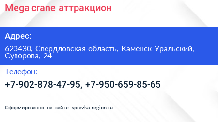 Mega crane, аттракцион по адресу 623430, Свердловская область, Каменск-Уральский, Суворова, 24 в дальнейшем Организация, размещена в следующих категориях: