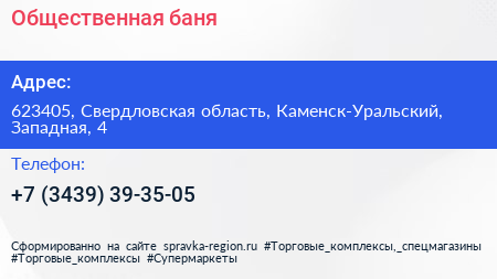 Общественная баня по адресу 623405, Свердловская область, Каменск-Уральский, Западная, 4 в дальнейшем Организация, размещена в следующих категориях: