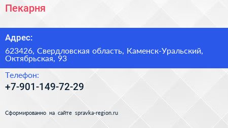 Пекарня по адресу 623426, Свердловская область, Каменск-Уральский, Октябрьская, 93 в дальнейшем Организация, размещена в следующих категориях: