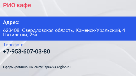 РИО, кафе по адресу 623408, Свердловская область, Каменск-Уральский, 4 Пятилетки, 25а в дальнейшем Организация, размещена в следующих категориях: