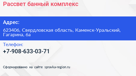 Рассвет, банный комплекс по адресу 623406, Свердловская область, Каменск-Уральский, Гагарина, 6а в дальнейшем Организация, размещена в следующих категориях: