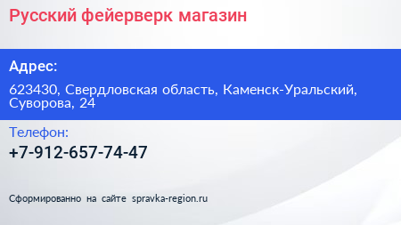 Русский фейерверк, магазин по адресу 623430, Свердловская область, Каменск-Уральский, Суворова, 24 в дальнейшем Организация, размещена в следующих категориях: