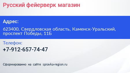 Русский фейерверк, магазин по адресу 623400, Свердловская область, Каменск-Уральский, проспект Победы, 11Б в дальнейшем Организация, размещена в следующих категориях: