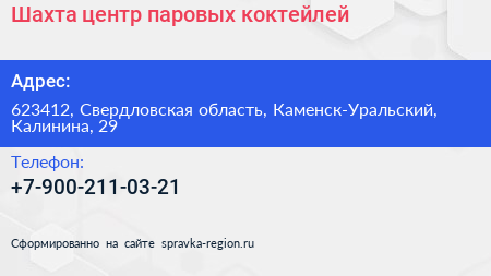Шахта, центр паровых коктейлей по адресу 623412, Свердловская область, Каменск-Уральский, Калинина, 29 в дальнейшем Организация, размещена в следующих категориях: