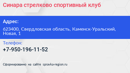 Синара, стрелково-спортивный клуб по адресу 623400, Свердловская область, Каменск-Уральский, Новая, 1 в дальнейшем Организация, размещена в следующих категориях:
