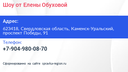 Шоу от Елены Обуховой по адресу 623418, Свердловская область, Каменск-Уральский, проспект Победы, 91 в дальнейшем Организация, размещена в следующих категориях: