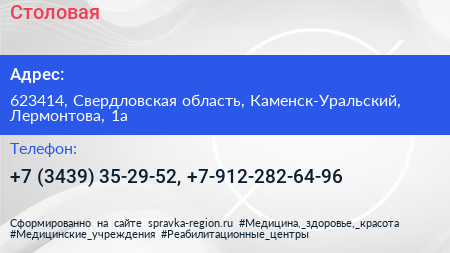 Столовая по адресу 623414, Свердловская область, Каменск-Уральский, Лермонтова, 1а в дальнейшем Организация, размещена в следующих категориях: