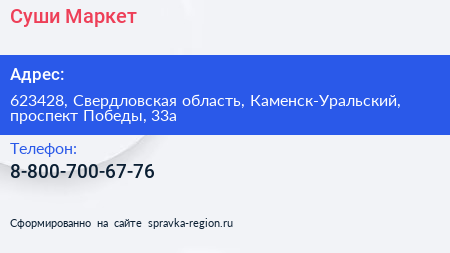 Суши-Маркет по адресу 623428, Свердловская область, Каменск-Уральский, проспект Победы, 33а в дальнейшем Организация, размещена в следующих категориях: