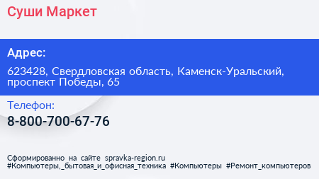 Суши-Маркет по адресу 623428, Свердловская область, Каменск-Уральский, проспект Победы, 65 в дальнейшем Организация, размещена в следующих категориях:
