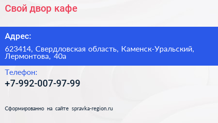 Свой двор, кафе по адресу 623414, Свердловская область, Каменск-Уральский, Лермонтова, 40а в дальнейшем Организация, размещена в следующих категориях: