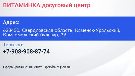 ВИТАМИНКА, досуговый центр по адресу 623430, Свердловская область, Каменск-Уральский, Комсомольский бульвар, 39 в дальнейшем Организация, размещена в следующих категориях: