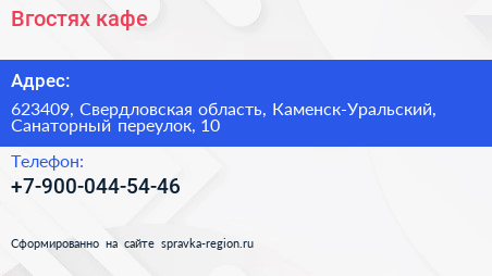Вгостях, кафе по адресу 623409, Свердловская область, Каменск-Уральский, Санаторный переулок, 10 в дальнейшем Организация, размещена в следующих категориях: