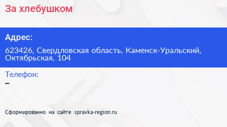 За хлебушком по адресу 623426, Свердловская область, Каменск-Уральский, Октябрьская, 104 в дальнейшем Организация, размещена в следующих категориях: