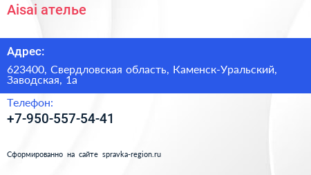 Aisai, ателье по адресу 623400, Свердловская область, Каменск-Уральский, Заводская, 1а в дальнейшем Организация, размещена в следующих категориях:
