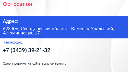Фотосалон по адресу 623406, Свердловская область, Каменск-Уральский, Алюминиевая, 17 в дальнейшем Организация, размещена в следующих категориях:
