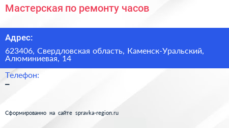 Мастерская по ремонту часов по адресу 623406, Свердловская область, Каменск-Уральский, Алюминиевая, 14 в дальнейшем Организация, размещена в следующих категориях: