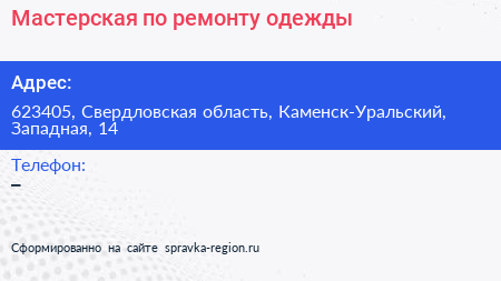Мастерская по ремонту одежды по адресу 623405, Свердловская область, Каменск-Уральский, Западная, 14 в дальнейшем Организация, размещена в следующих категориях:
