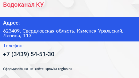 Водоканал КУ по адресу 623409, Свердловская область, Каменск-Уральский, Ленина, 113 в дальнейшем Организация, размещена в следующих категориях:
