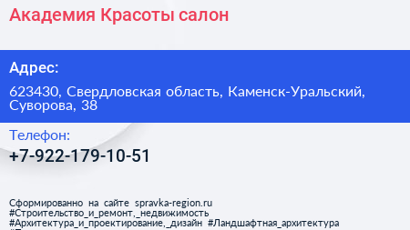 Академия Красоты, салон по адресу 623430, Свердловская область, Каменск-Уральский, Суворова, 38 в дальнейшем Организация, размещена в следующих категориях: