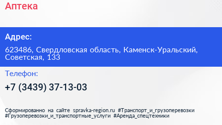 Аптека по адресу 623486, Свердловская область, Каменск-Уральский, Советская, 133 в дальнейшем Организация, размещена в следующих категориях: