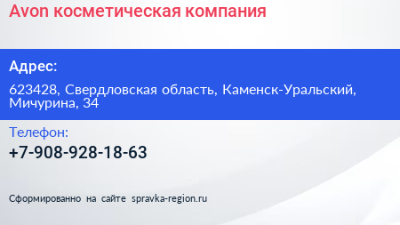 Avon, косметическая компания по адресу 623428, Свердловская область, Каменск-Уральский, Мичурина, 34 в дальнейшем Организация, размещена в следующих категориях: