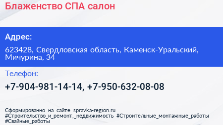 Блаженство, СПА-салон по адресу 623428, Свердловская область, Каменск-Уральский, Мичурина, 34 в дальнейшем Организация, размещена в следующих категориях: