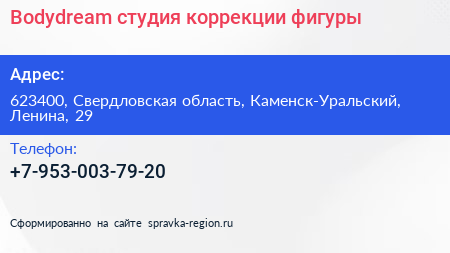 Bodydream, студия коррекции фигуры по адресу 623400, Свердловская область, Каменск-Уральский, Ленина, 29 в дальнейшем Организация, размещена в следующих категориях: