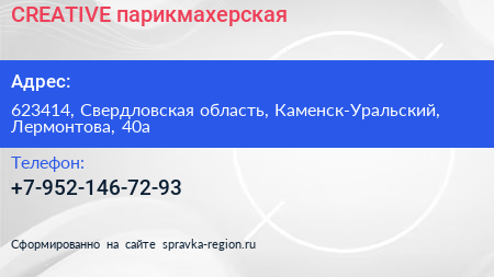 CREATIVE, парикмахерская по адресу 623414, Свердловская область, Каменск-Уральский, Лермонтова, 40а в дальнейшем Организация, размещена в следующих категориях: