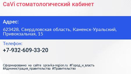 CaVi, стоматологический кабинет по адресу 623428, Свердловская область, Каменск-Уральский, Привокзальная, 15 в дальнейшем Организация, размещена в следующих категориях: