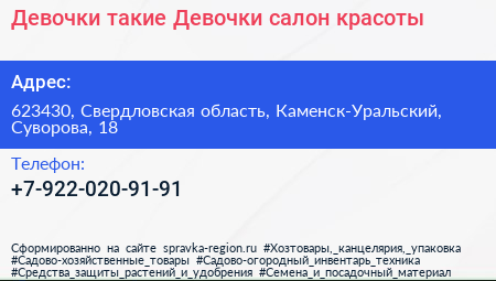 Девочки такие Девочки, салон красоты по адресу 623430, Свердловская область, Каменск-Уральский, Суворова, 18 в дальнейшем Организация, размещена в следующих категориях: