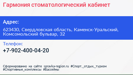 Гармония, стоматологический кабинет по адресу 623430, Свердловская область, Каменск-Уральский, Комсомольский бульвар, 32 в дальнейшем Организация, размещена в следующих категориях: