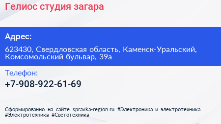 Гелиос, студия загара по адресу 623430, Свердловская область, Каменск-Уральский, Комсомольский бульвар, 39а в дальнейшем Организация, размещена в следующих категориях: