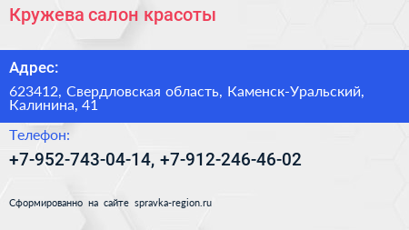 Кружева, салон красоты по адресу 623412, Свердловская область, Каменск-Уральский, Калинина, 41 в дальнейшем Организация, размещена в следующих категориях: