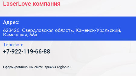 LaserLove, компания по адресу 623426, Свердловская область, Каменск-Уральский, Каменская, 66а в дальнейшем Организация, размещена в следующих категориях: