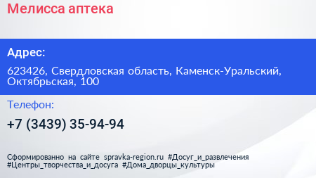 Мелисса, аптека по адресу 623426, Свердловская область, Каменск-Уральский, Октябрьская, 100 в дальнейшем Организация, размещена в следующих категориях: