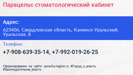 Парацельс, стоматологический кабинет по адресу 623406, Свердловская область, Каменск-Уральский, Уральская, 8 в дальнейшем Организация, размещена в следующих категориях: