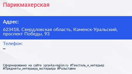 Парикмахерская по адресу 623418, Свердловская область, Каменск-Уральский, проспект Победы, 93 в дальнейшем Организация, размещена в следующих категориях: