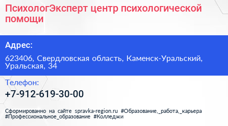 ПсихологЭксперт, центр психологической помощи по адресу 623406, Свердловская область, Каменск-Уральский, Уральская, 34 в дальнейшем Организация, размещена в следующих категориях: