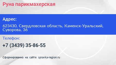 Руна, парикмахерская по адресу 623430, Свердловская область, Каменск-Уральский, Суворова, 36 в дальнейшем Организация, размещена в следующих категориях: