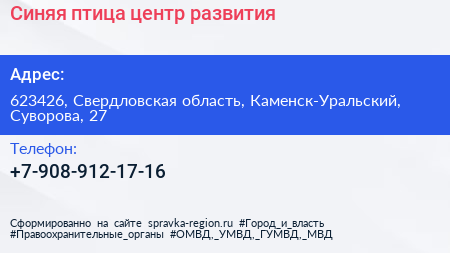 Синяя птица, центр развития по адресу 623426, Свердловская область, Каменск-Уральский, Суворова, 27 в дальнейшем Организация, размещена в следующих категориях: