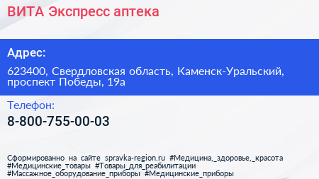 ВИТА Экспресс, аптека по адресу 623400, Свердловская область, Каменск-Уральский, проспект Победы, 19а в дальнейшем Организация, размещена в следующих категориях: