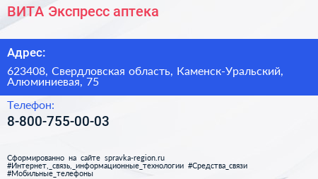 ВИТА Экспресс, аптека по адресу 623408, Свердловская область, Каменск-Уральский, Алюминиевая, 75 в дальнейшем Организация, размещена в следующих категориях:
