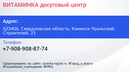 ВИТАМИНКА, досуговый центр по адресу 623406, Свердловская область, Каменск-Уральский, Строителей, 21 в дальнейшем Организация, размещена в следующих категориях: