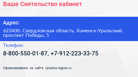 Ваше Сиятельство, кабинет по адресу 623400, Свердловская область, Каменск-Уральский, проспект Победы, 5 в дальнейшем Организация, размещена в следующих категориях: