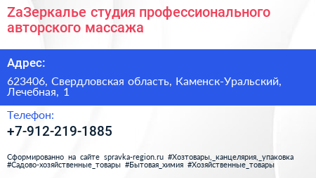 ZaЗеркалье, студия профессионального авторского массажа по адресу 623406, Свердловская область, Каменск-Уральский, Лечебная, 1 в дальнейшем Организация, размещена в следующих категориях: