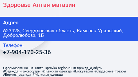 Здоровье Алтая, магазин по адресу 623428, Свердловская область, Каменск-Уральский, Добролюбова, 1Б в дальнейшем Организация, размещена в следующих категориях: