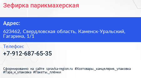 Зефирка, парикмахерская по адресу 623462, Свердловская область, Каменск-Уральский, Гагарина, 1/1 в дальнейшем Организация, размещена в следующих категориях: