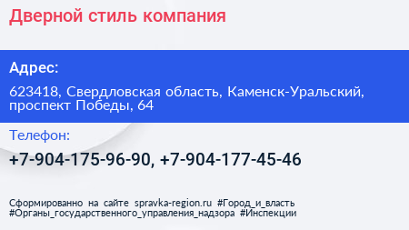 Дверной стиль, компания по адресу 623418, Свердловская область, Каменск-Уральский, проспект Победы, 64 в дальнейшем Организация, размещена в следующих категориях: