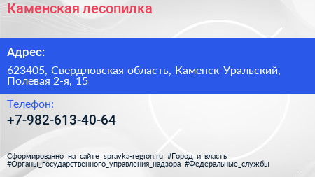 Каменская лесопилка по адресу 623405, Свердловская область, Каменск-Уральский, Полевая 2-я, 15 в дальнейшем Организация, размещена в следующих категориях: